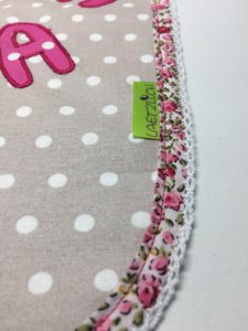 Milena – Beiges Lätzchen mit weissen Punkten.